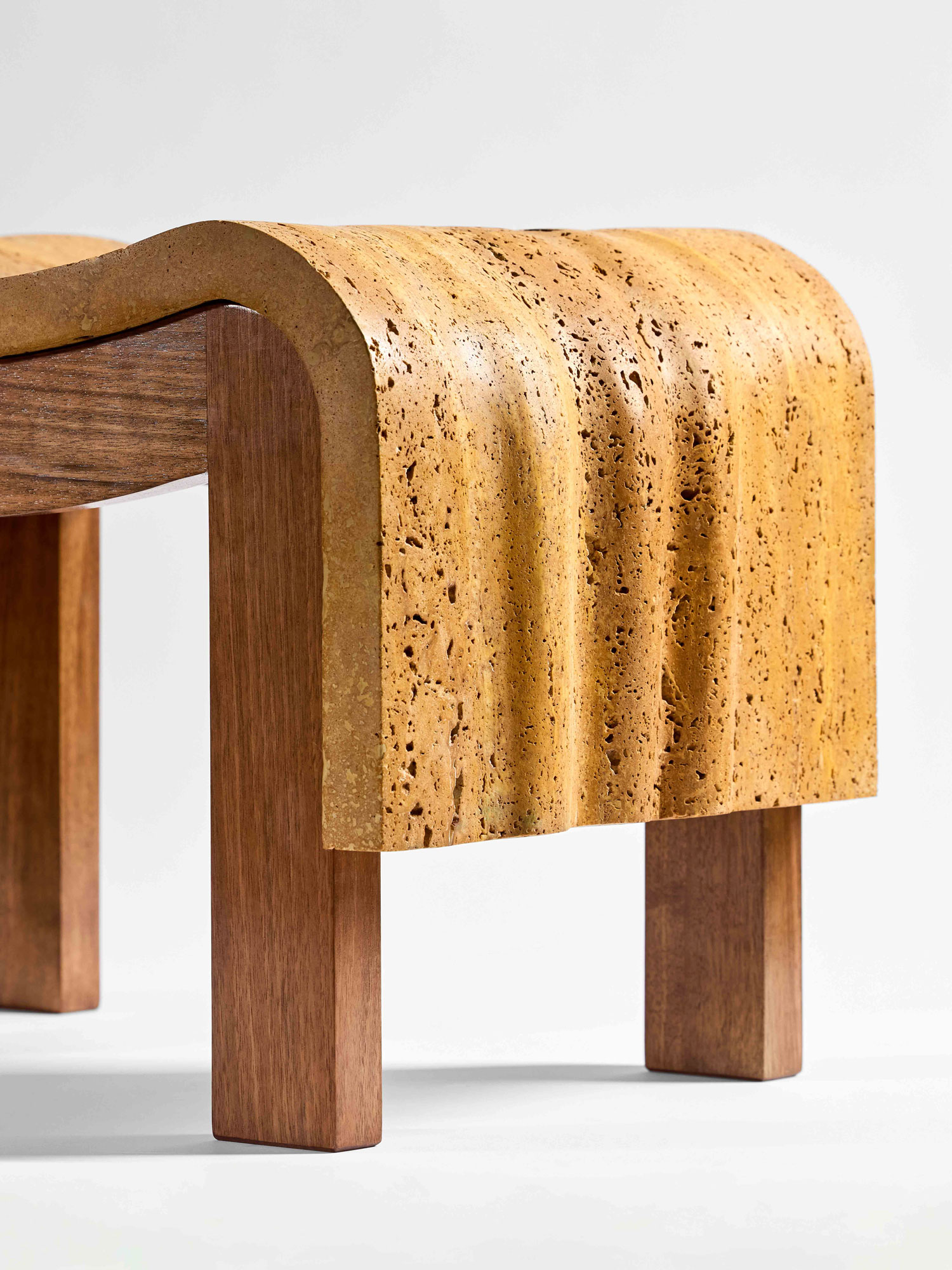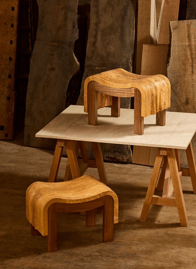 Le tabouret PHILAE, dessiné par le Studio OUD pour la galerie MCDE, rend hommage au CURULE iconique de Pierre Chareau et en revisite les lignes à travers un drapé antique en travertin jaune de Perse, dont les nuances solaires évoquent la lumière sur le Temple de Philae au crépuscule.